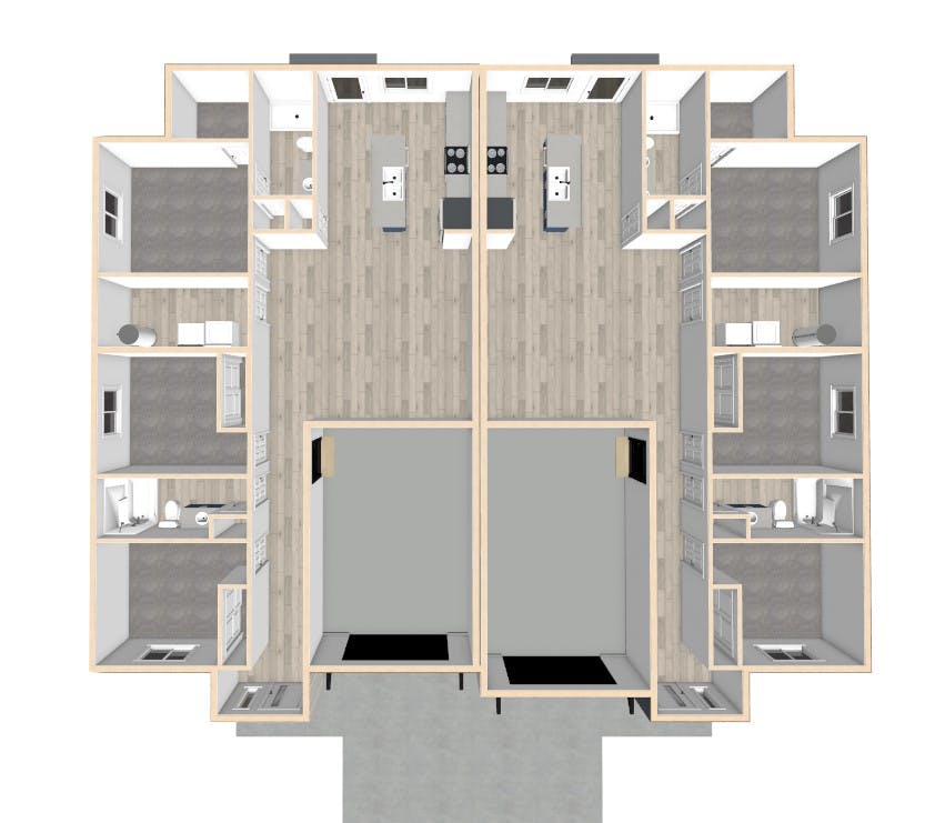 The Bobcat is a 1,316 SF, 3-bed, 2-bath townhome that blends efficient design with timeless traditional aesthetics. While it shares the same well-planned layout as The Grizzly, The Bobcat features a classic roof truss design, giving it a more familiar and enduring curb appeal.