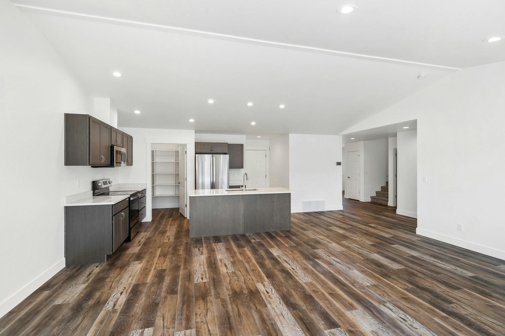 The open-concept living/dining room area boasts a 10' 4" tall, vaulted ceiling, further accentuated by an additional window near the dining area. The kitchen impresses with G.E. stainless steel appliances, a large Walk-in Pantry, and an oversized 7' 3" long countertop island.