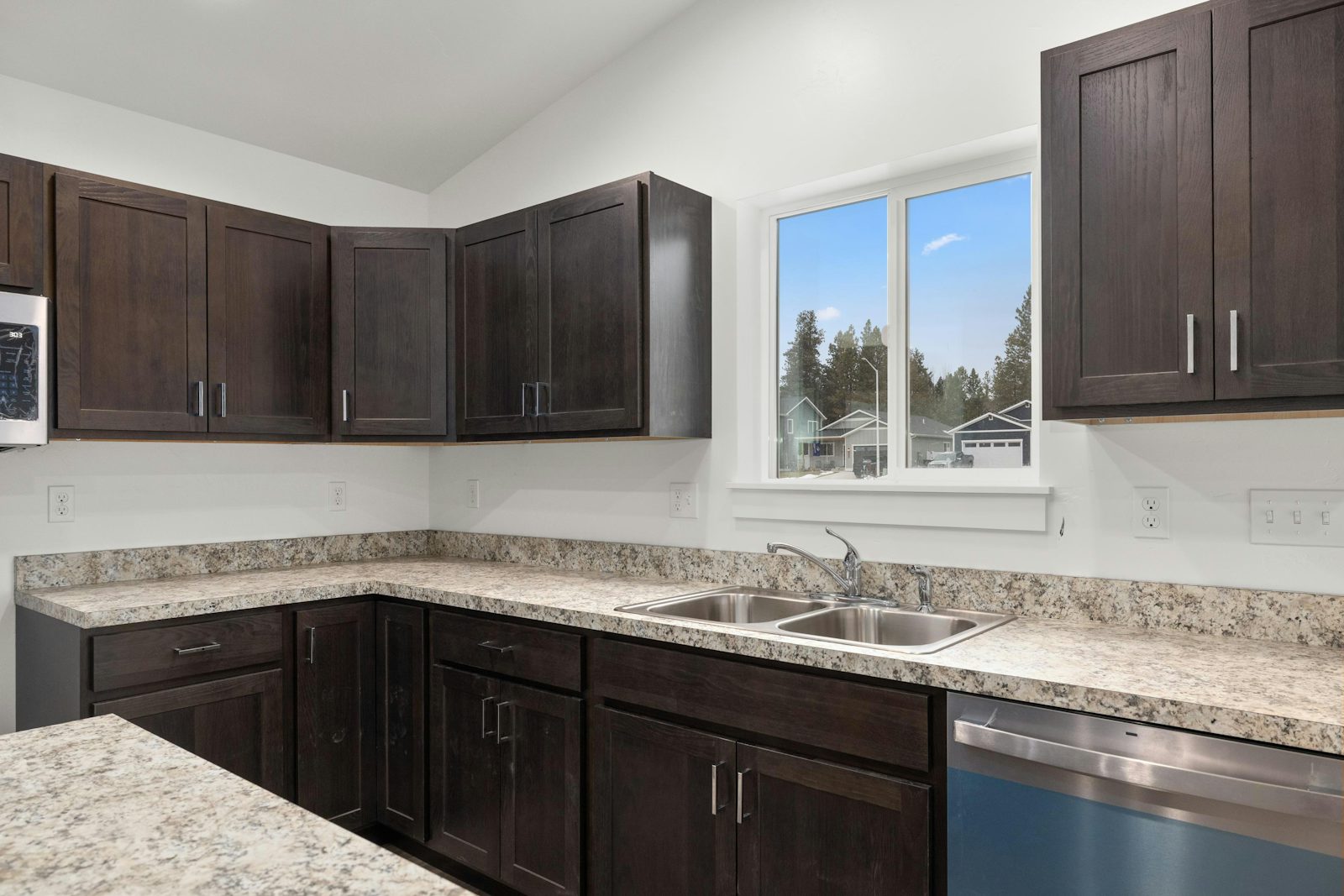 This single-level home offers easy, low-maintenance living with everything you need on one floor. The kitchen combines warmth and practicality with dark hickory cabinetry, durable laminate countertops, and a sleek GE stainless steel appliance package-perfect for everyday meals or weekend gatherings.