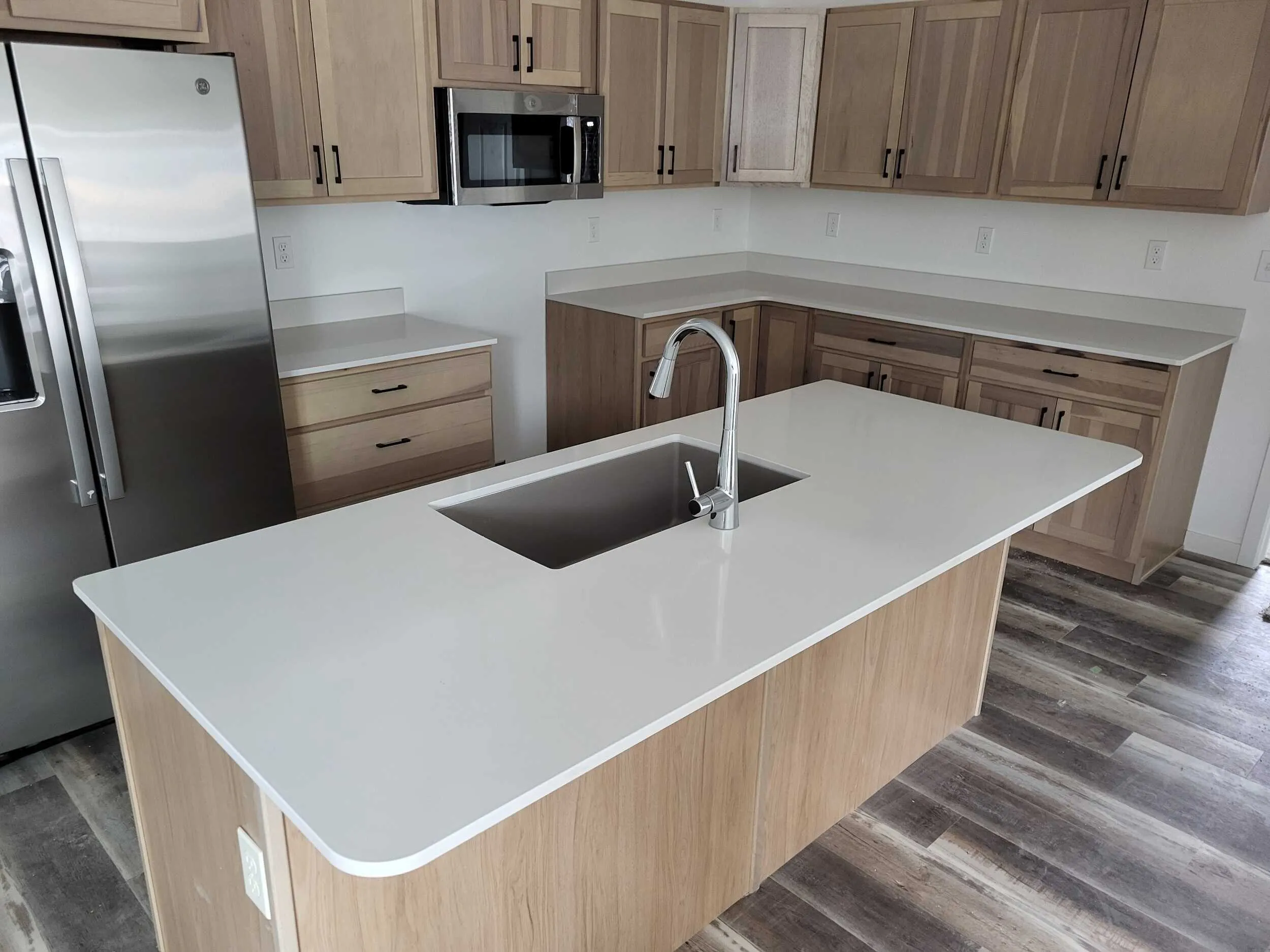 Your kitchen is outfitted with Sand Castle colored cabinetry- a soft, neutral tone that offers warmth without overpowering the space. The countertops are Miami White Silestone, a crisp elegant surface that complements the cabinetry and brightens the room.